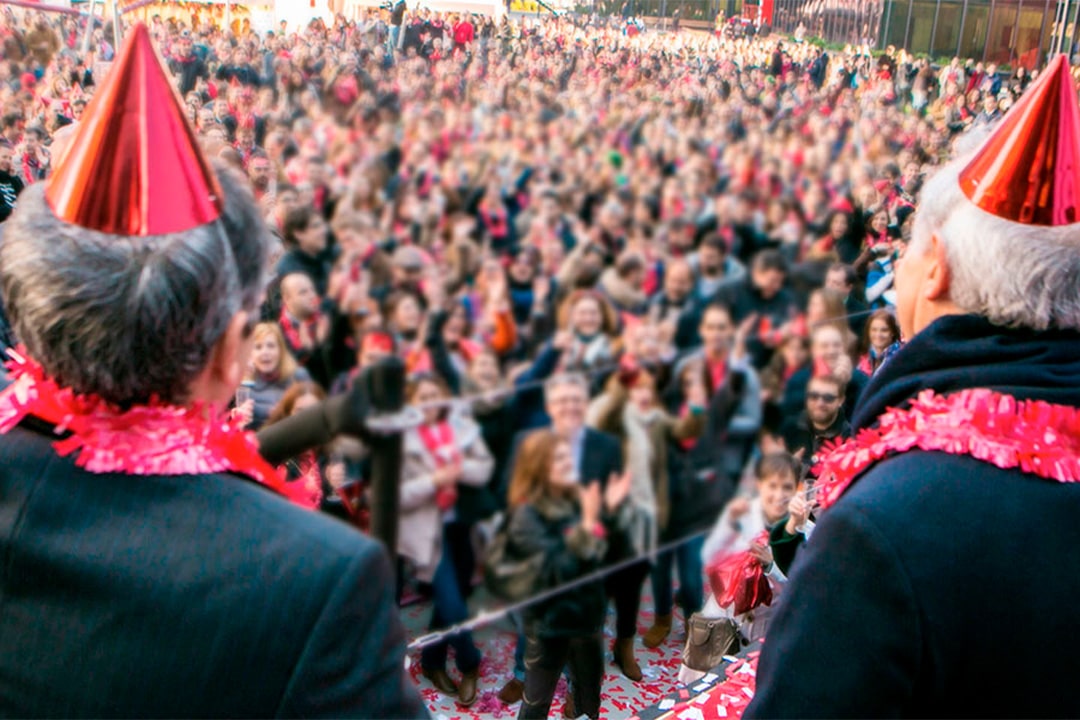 ¿La idea? Convertir la maravillosa Vodafone Plaza en la Plaza Mayor por unas horas y celebrar juntos el fin de año… ¡un 19 de diciembre, un fin de año adelantado! Castañeras, zancudos, juegos con duendes, Belén viviente, photocall, karaoke, un escenario simulando la Puerta del Sol, confeti, córner solidario… ¡todo ello con Dani Mateo como maestro de ceremonias imitando al mismísimo Ramón García con su característica capa!